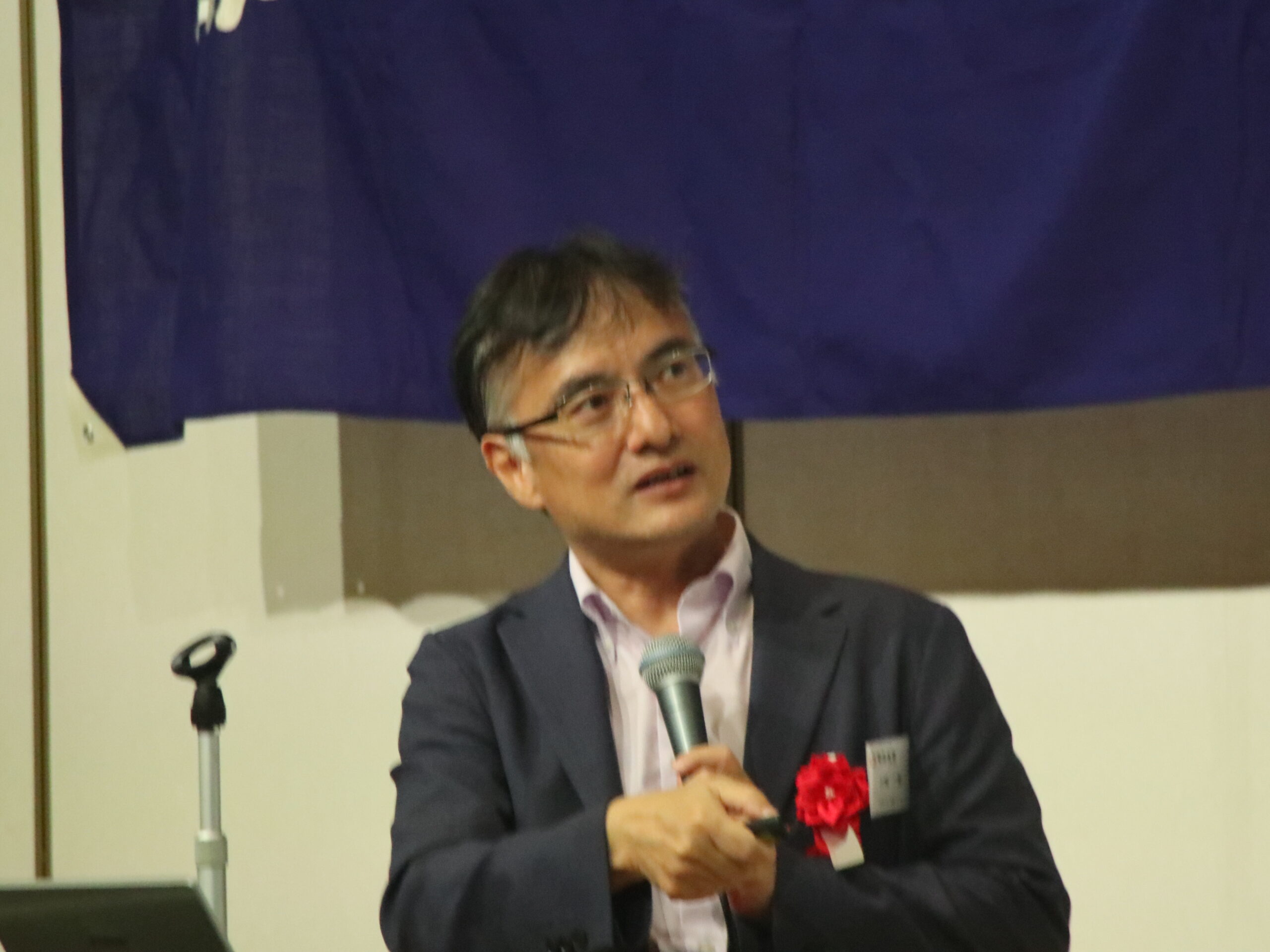 第一部の学術講演会では中央大学総合政策学部 川崎一泰教授(熊本出身)から「AI、DXとどう付き合うか~働き方の変化と今後求められる改革~」と題し、講演いただきました。労働の視点から世界における日本の現在地、日本国内の問題点を紐解き、「DXはコスト削減のためではなく、生産性を高め、商品価格や賃金のアップのために使うこと」「高いサービスを提供し、高い利益を得られる構造転換が必要」などの目指すべき方向性をご教示いただきました。