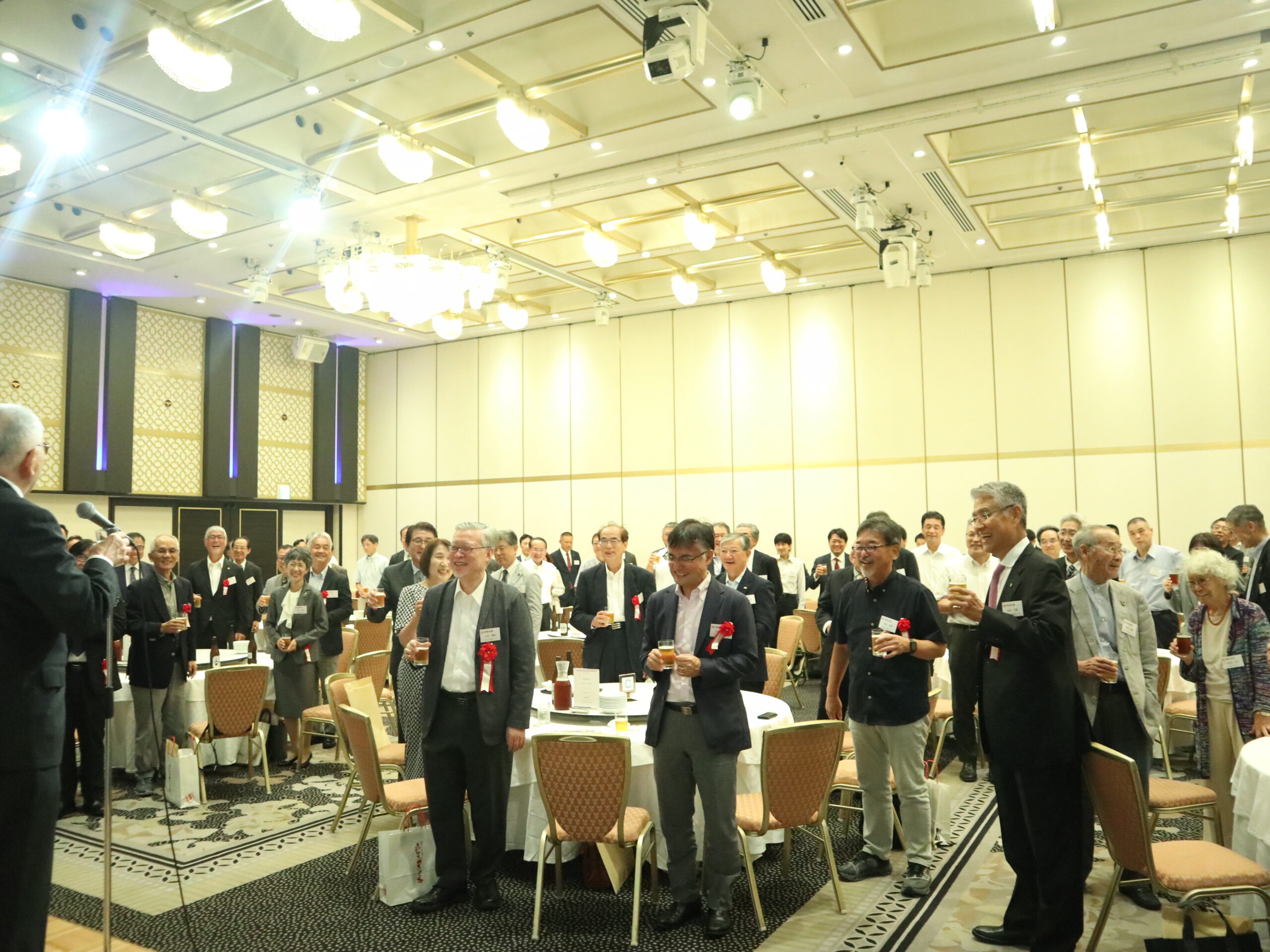 皆さんお待ちかねの第三部懇親会は学員会熊本支部 福永力三常任顧問の乾杯でスタート。初めましての方もおなじみの方も、世代は違っても皆白門の同窓です。各テーブルで大いに会話に花が咲きました!今回は初参加の方にご登壇いただき、挨拶をお願いしましたが、学生時代のことや、現在のお仕事についてお話いただき、聴くのも楽しく、ご自身のPRにもなったのではないでしょうか?